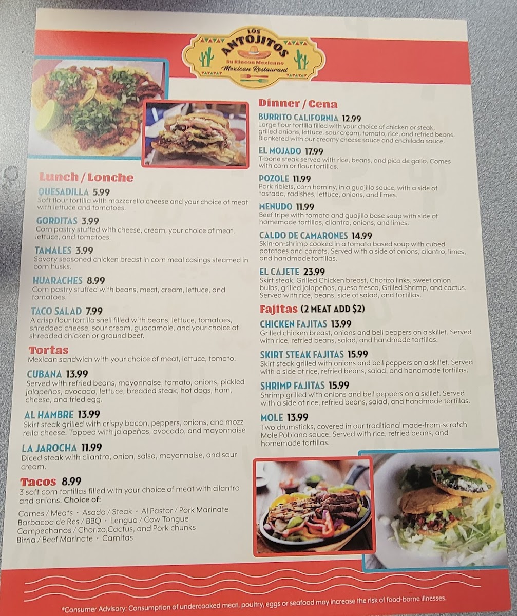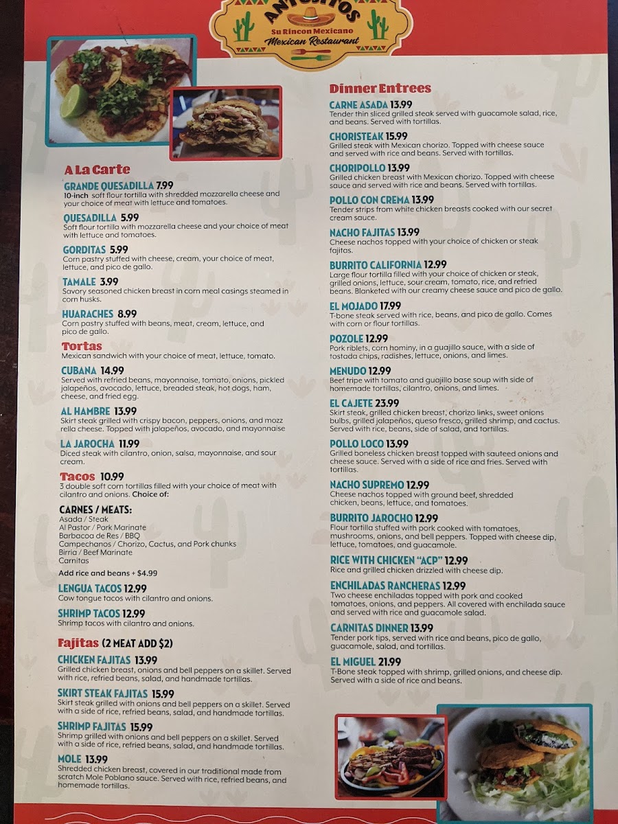 A La Carte, Tortas, Carnes / Meats:, Fajitas, Dinner Entrees